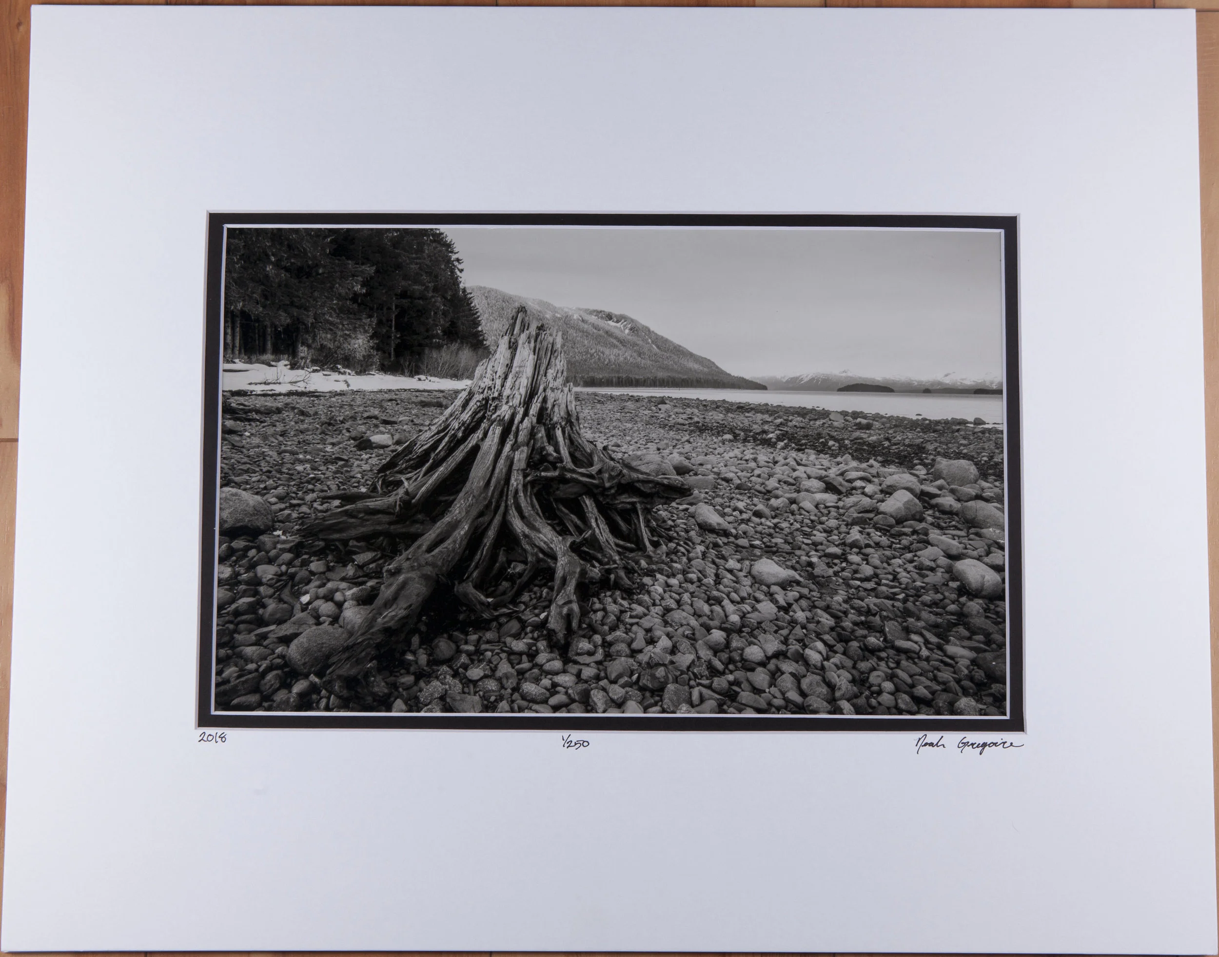 I found this driftwood on a beach on Mitkoff Island in Southeast Alaska. The print is matted with a minimalist white on black double matte. This is a limited edition, so there will only be 250 printed this size. The image is 11x14 inches, but the outer dimension of the matte is 16x20 inches. Since this is a standard frame size, you will not have to purchase a custom frame with it, however I do recommend a minimalist black frame with UV protected glass. You have the option of signed or unsigned, and if you have any other special requests feel free to message me and we can talk about what I can do for you. All materials used are acid free, meaning these prints are made to last a lifetime without any discoloration or degradation of quality.